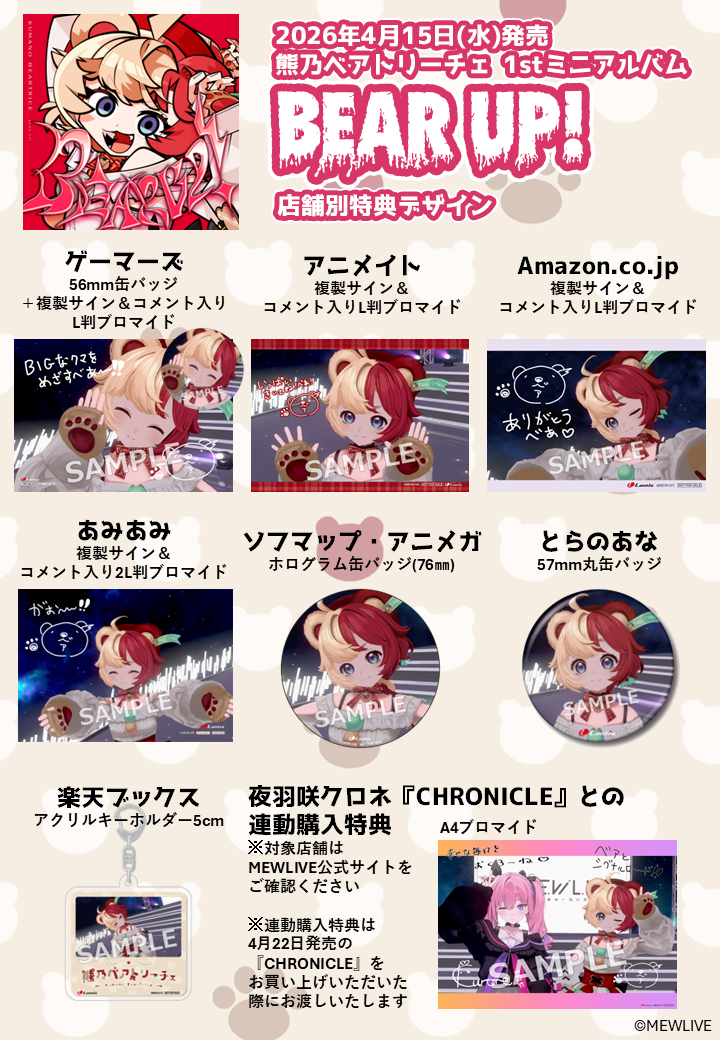 さらに、熊乃ベアトリーチェ1stミニアルバム「BEAR UP!」・夜羽咲クロネ1stミニアルバム「CHRONICLE」を両方ご購入いただいた方には"A4ブロマイド(1種)"もお渡しいたします。